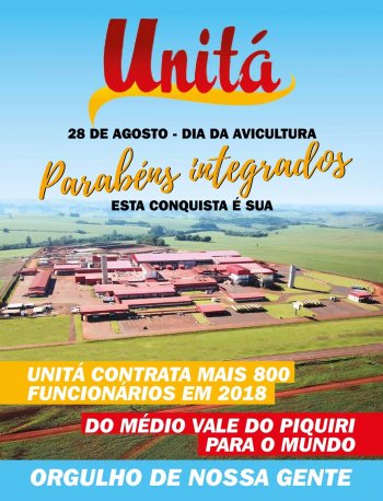 Esse cenário comprova que a avicultura,atualmente e novamente pelas próximas décadas, é e será fundamental, para a produção de alimentos. Porém,sua contribuição não será apenas nesse propósito, mas também na geração de empregos, na promoção do aumento de receita financeira para todos os envolvidosna cadeia produtiva, na oportunidade de diversificação de produção para o produtor rural e fixação da mão de obra no campo, entre outros benefícios.Nesse contexto, a Coagru e Unitá, seguem firmes com os seus planejamentos de crescimento da atividade avícola, através da construção de novos aviários em toda a sua área da atuação e a ampliação do abatedouro de aves.