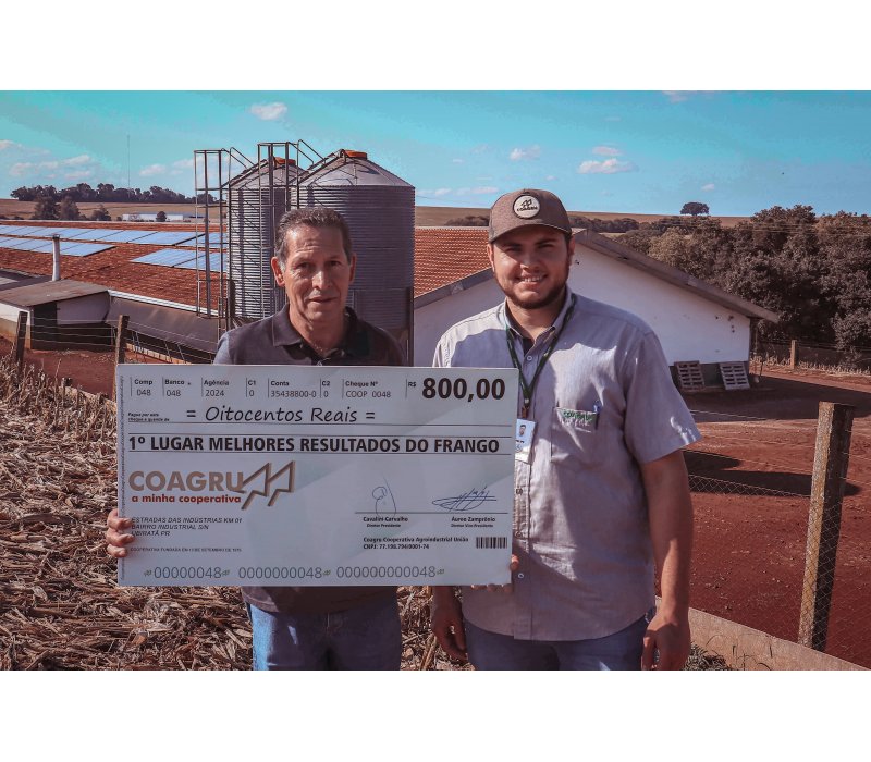 “Em primeiro lugar, foi Deus que ajudou. Cuidamos bem da água e da alimentação - o que fez toda a diferença. No frio, ter água em abundância é essencial. A Coagru oferece todo o suporte com ração, pintainho e insumos de qualidade. O bom resultado vem da parceria entre produtor e equipe técnica. Fiquei muito feliz com o prêmio. Depois de tempos difíceis, esse reconhecimento trouxe ânimo para continuar melhorando.”